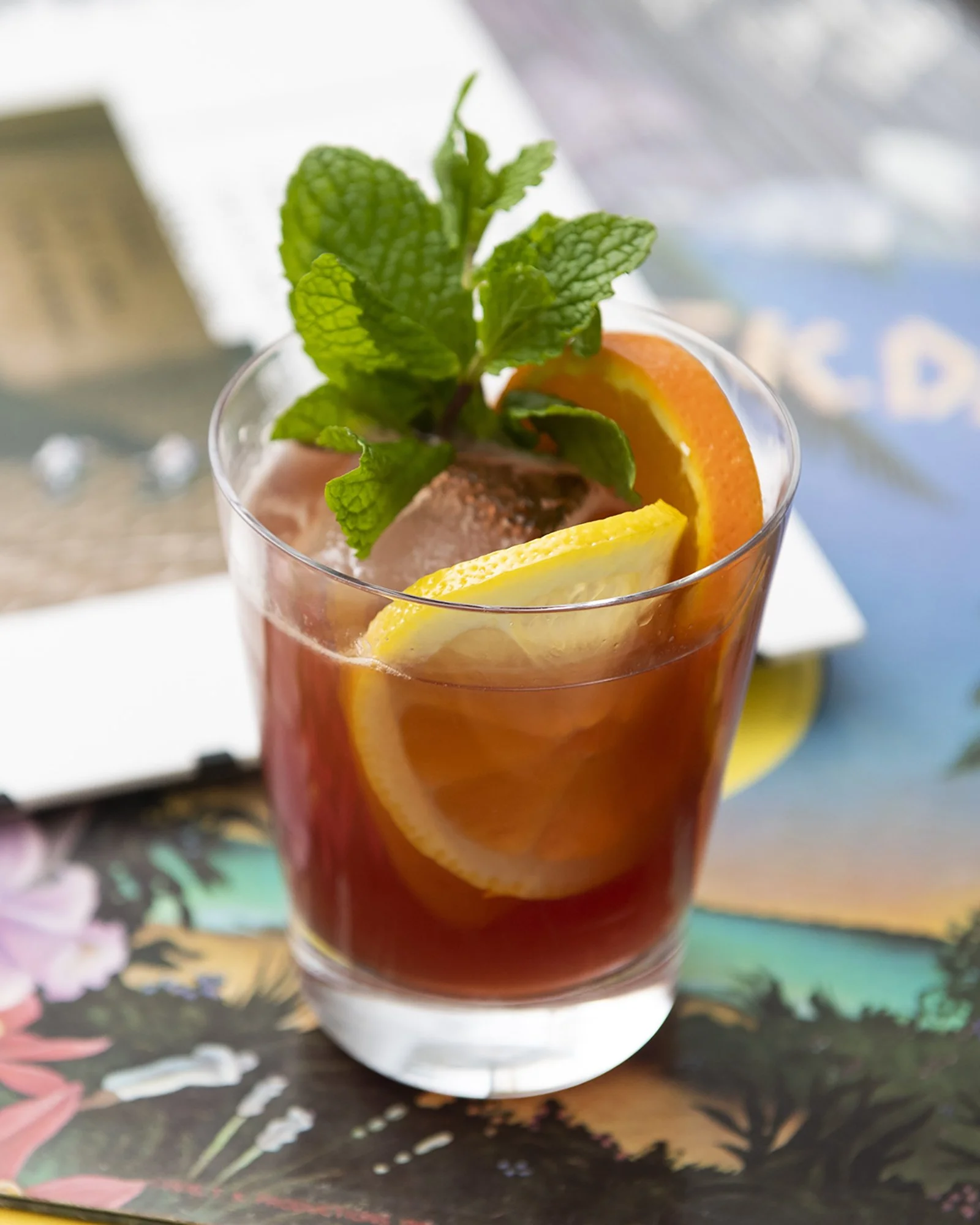 This tropical whiskey tea punch uses Portuguese Port wine, Jack Daniel's, applejack, and an Earl Grey syrup.